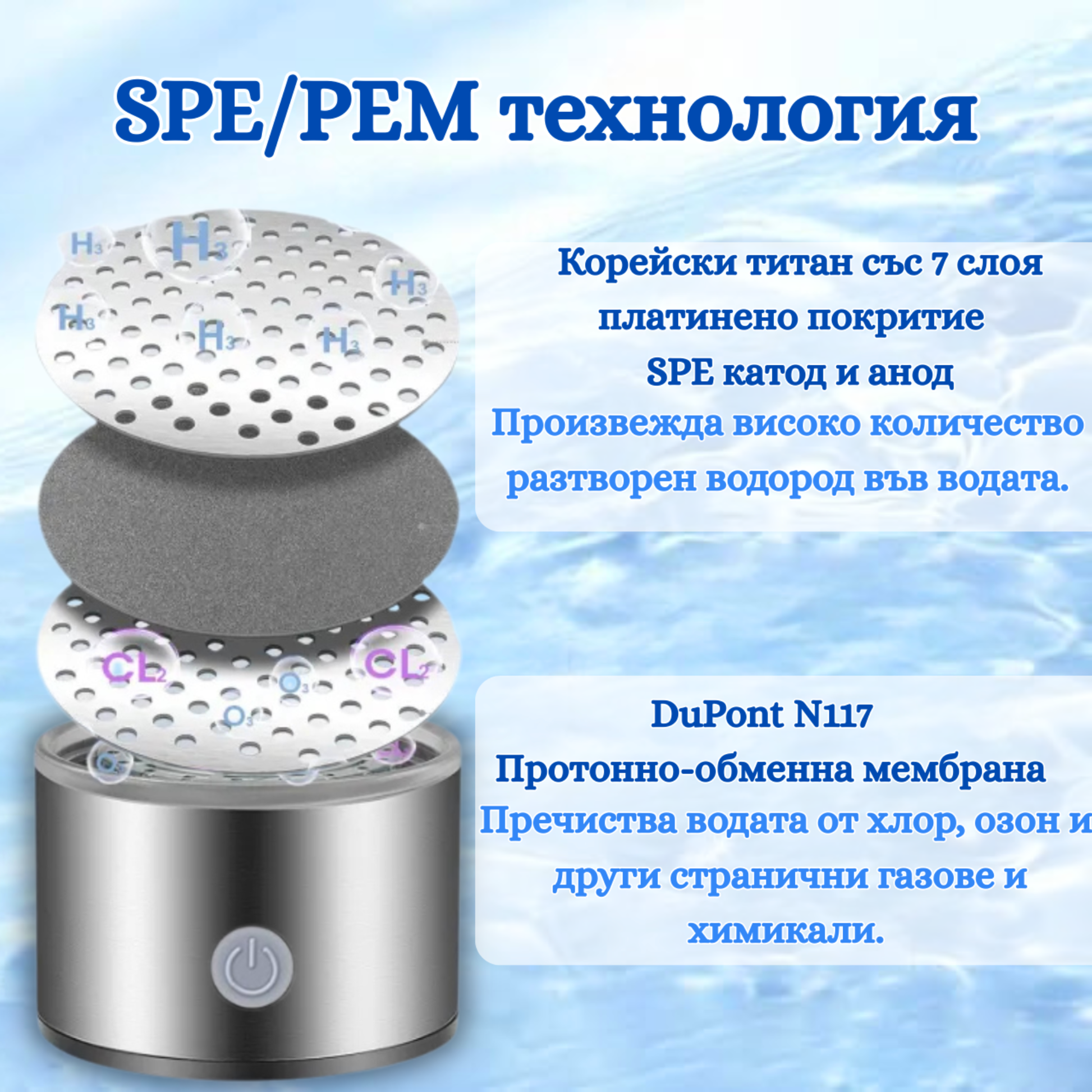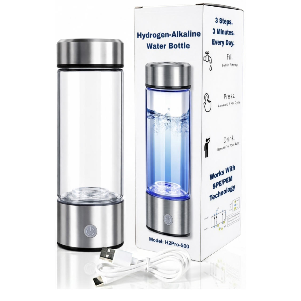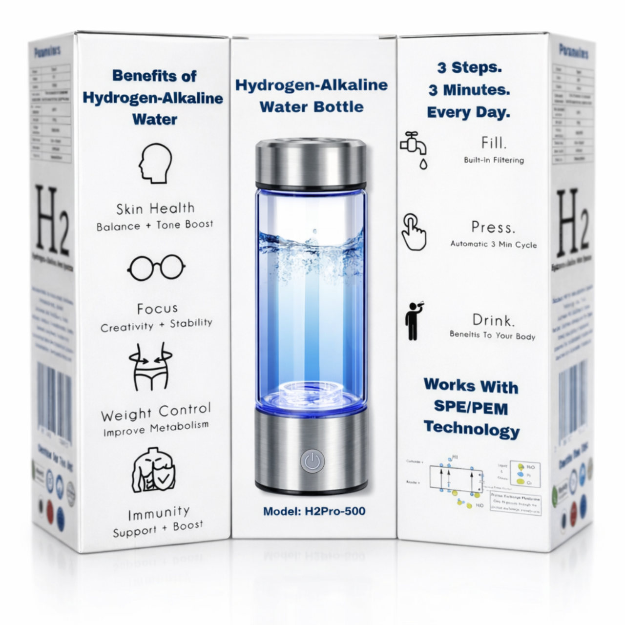 Бутилката използва SPE/PEM технология. Чрез електролиза водата се обогатява с молекулярен водород, който повишава алкалността и подобрява полезните качества на водата.